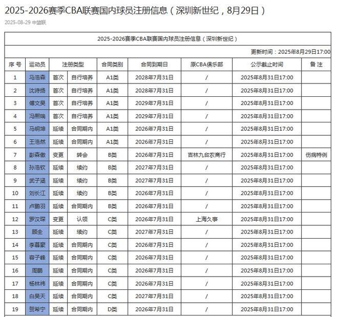 雷速体育8月29日讯 根据CBA官方的公示,深圳男篮完成19人注册,外界关注的主帅周鹏,继续兼任球员的角色,顾全,孙浩钦,武子涵等球员完成续约。