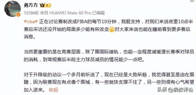 媒体人勇方方发文点评说道:正在讨论赛制改成FIBA的每节10分钟,我挺支持,对我们来说夜里10点半赛后采访还没开始的局面多少能有所改变,对大家来说也能在睡前看到更多赛后消息。
