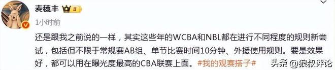 媒体人麦穗丰发文点评:其实这些年的WCBA和NBL都在进行不同程度的规则新尝试,包括但不限于常规赛AB组、单节比赛时间10分钟、外援使用规则。要是效果好,都可以用在曝光度最高的CBA联赛上面。
