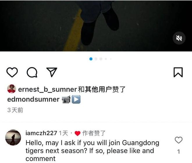 具体情况是有球迷跑到萨姆纳的个人社媒询问,大概意思是:“下赛季是否加盟广东,如果加盟的话请点赞我这条评论。”结果萨姆纳真的在评论区点赞了,看来他是非常关注广东队的,因此才会点赞球迷的评论。
