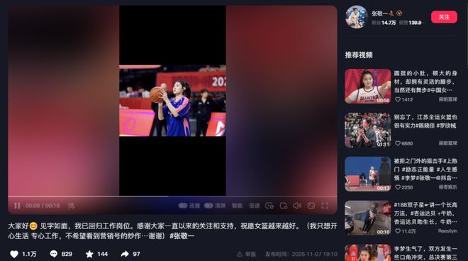 北京时间11月9日,“中国女库里”张敬一通过社媒官宣,她已经告别WCBA赛场,重返北师大工作岗位,并且感谢大家一直以来的关注和支持,她曾经在WCBA赛场有过单场命中16记三分轰下50分的表现。