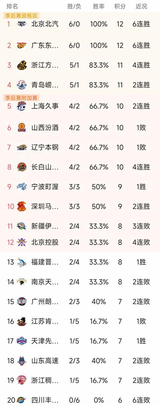 CBA常规赛第6轮结束了所有比赛,最新积分榜如下!