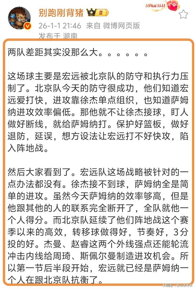 赛后,媒体人别跑刚背猪发文点评本场比赛,道出了广东惨败的原因,“两队差距其实没那么大。这场球主要是宏远被北京的防守和执行力压制了。北京今天的防守很成功,他们知道宏远爱打快,进攻靠徐杰单点组织,也知道萨姆纳进攻效率偏低。那他就不让徐杰接球,盯人做好断线,就给萨姆纳打。保护好篮板,做好退防,延误,想方设法让宏远打不好快攻,陷入阵地战。