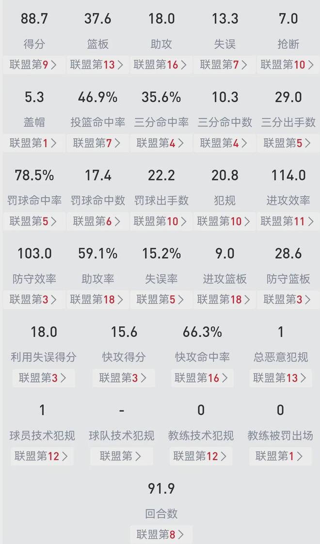 没有杨瀚森的青岛队,竟然还那么猛,迄今为止场均得分88.7联盟第九,场均三分命中数(10.3)&命中率(35.6%)均是第四,进攻节奏92.1第八,防守效率103.0第三,利用失误得分18.0第三等等。