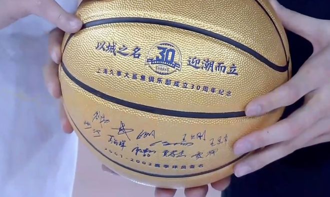 紧接着老队长章文琪更是将印有2001-2002冠军赛季成员签名的篮球赠予现役上海久事男篮队长王哲林,大鲨鱼三十年来的精神在这一刻得到传递!
