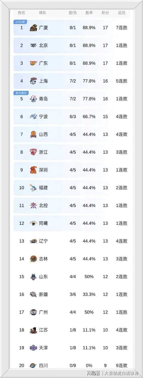 上赛季的常规赛亚军山西队,仅仅一个赛季之后,状态大跌,被缺少郭艾伦的广州队爆冷,总战绩4胜5负。