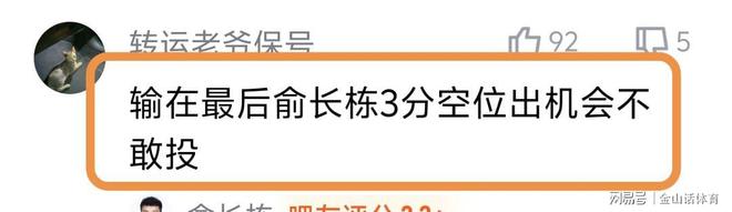 许多球迷质疑俞长栋的空位不敢投。“还剩30多秒,俞长栋出来机会投了回来还有一次进攻机会。然而愣是原地空位等着给了外援,投不进,只能犯规!”;“输在最后俞长栋3分空位出机会不敢投。”;“俞长栋真是牛,空位都不投。”……