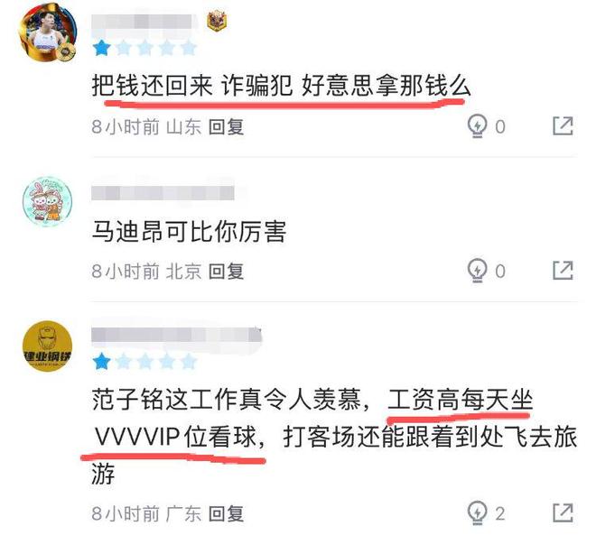 全场比赛,拿着600万年薪的范子铭0分0板0助0帽0断,所有数据统计只有1次被盖和2次犯规,正负值-5,真是惨不忍睹。有球迷直言:诈骗犯,好意思拿那么多钱?