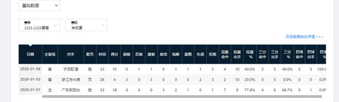 前六场比赛,他的三分命中率依次是33.3%,0%,50%,16.7%,42.9%,25%。
