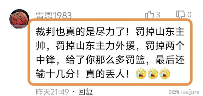 “裁判也真的是尽力了!罚掉山东主帅,罚掉山东主力外援,罚掉两个中锋,给了你那么多罚篮,最后还输十几分!真的丢人!”;“叼着个哨子胡吹,我说心里话”;“克里斯罚下,主教练罚下,陶汉林罚下,郭凯罚下,真牛逼!”;“这主场哨真黑呀!”……