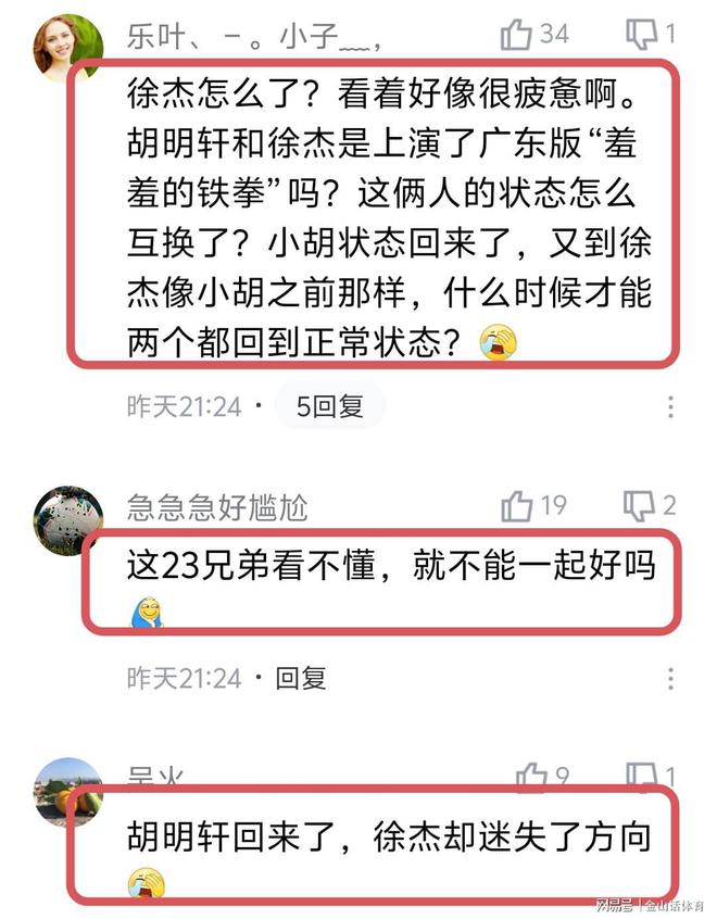 徐杰近几场比赛,持续低迷的表现,以及与胡明轩“灵魂互换”的现象,也让许多广东球迷非常着急,纷纷在网络上留言“胡明轩好不容易好起来,却换到徐杰低迷了。”;“我看到杰师傅眼神都是迷离的,估计真的太累,也就休息了一场,机器人都受不了。”;“徐杰怎么了?看着好像很疲惫啊。胡明轩和徐杰是上演了广东版“羞羞的铁拳”吗?这俩人的状态怎么互换了?小胡状态回来了,又到徐杰像小胡之前那样,什么时候才能两个都回到正常状态?”;“这23兄弟看不懂,就不能一起好吗”;“胡明轩回来了,徐杰却迷失了方向”……
