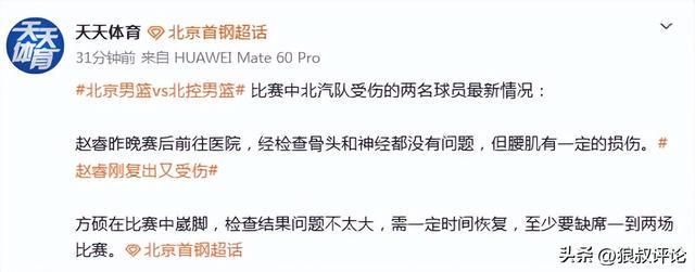 北京媒体:赵睿检查后骨头和神经都没问题只是腰肌有一定的损伤
