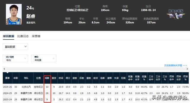 虽然说现阶段仍处于黄金年龄段,但过去3个赛季,赵睿持续不断的伤病困扰,他在联赛当中的出勤率太低了,自从离开广东队后,一共就打了45场常规赛。