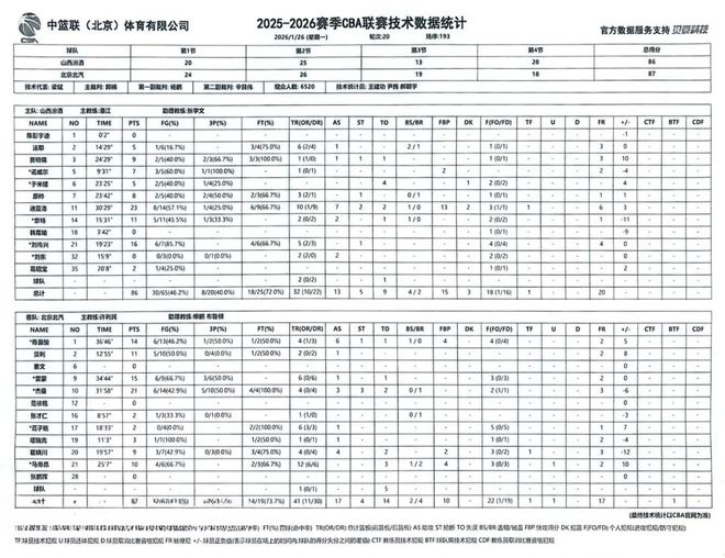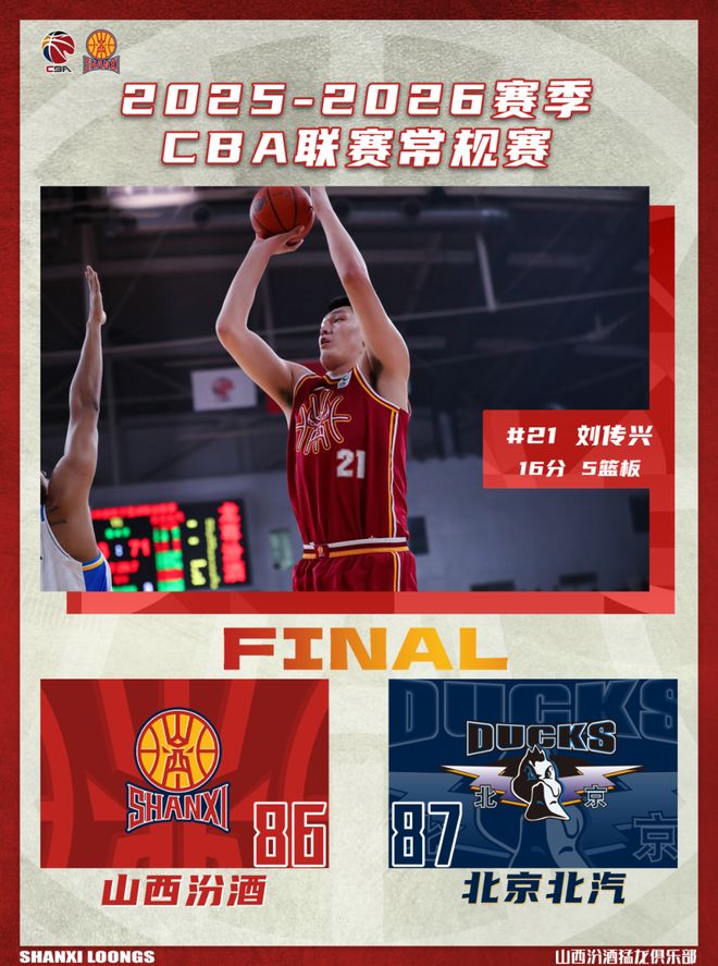 北京时间2026年1月26日19:35,2025-2026赛季CBA联赛常规赛第20轮继续进行,山西汾酒主场迎战北京北汽。两队历史上共交手53次,山西汾酒19胜34负,上赛季两队交手5次,山西汾酒2胜3负;本赛季两队交手1次,山西汾酒1胜0负。本场比赛,山西队没有做足面对困难的准备,开局慢热,防守松懈,丢篮板球,攻防两端都暴露出很多问题。末节全队奋起直追虽然将分差迫近,但最后时刻依然输在了篮板球,遗憾失利,最终全场比赛结束,山西汾酒86:87不敌北京北汽。