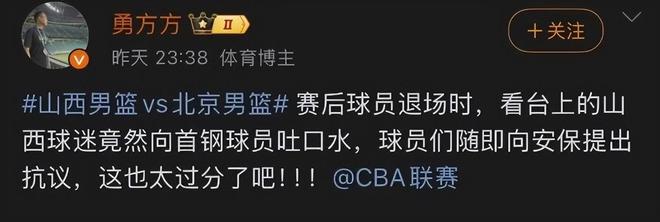山西男篮主场和北京男篮的比赛打得非常激烈,结果是以1分之差不敌对手,遭遇了一波三连败。据北京体育记者勇方方透露,在比赛结束后北京男篮球员退场时,不仅遭到了现场球迷辱骂,更有球迷从看台上向雷蒙等球员吐口水,引发了媒体和球迷的关注。在赛后的新闻发布会上,雷蒙也提到了此事,他表示球队输掉了比赛,球迷骂几句发泄一下也就算了,向球员吐口水的行为就跌分儿了。