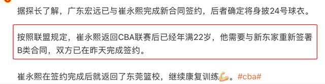 敲定!崔永熙与广东签下B类续约合同,选择24号球衣,盼再冲NBA