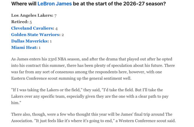 ESPN对此解释道:随着詹姆斯进入他的第23个NBA赛季,以及今夏他选择执行合同后上演的那些戏剧性事件,他的未来引发了诸多猜测。然而,受访者们对此远没有达成共识,一位东部联盟球探很好地概括了普遍情绪。“如果让我在湖人队和整个联盟之间选,我会选整个联盟。但我会选择湖人队胜过任何特定球队,尤其是考虑到他们是唯一有最清晰的薪资空间能够支付他薪水的球队。”