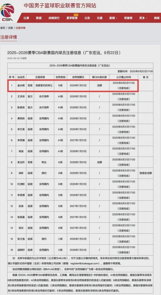 CBA官网更新了广东队25-26赛季国内球员注册信息,显示崔永熙签约四年B类合同。