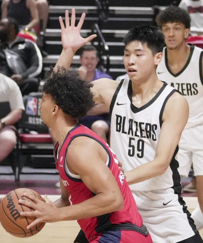 去年7月16日,NBA夏季联赛中,崔永熙(前右)代表波特兰开拓者队出战对阵华盛顿奇才队的比赛。 新华社发