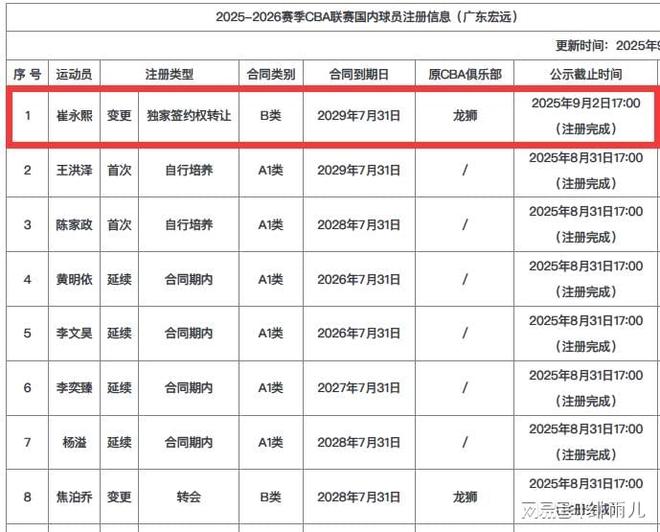 2024-25赛季CBA联赛的休赛期还在继续,一则关于夺冠大热门广东男篮注册新援崔永熙的消息持续升温。据中国篮协更新注册信息,崔永熙已经正式与广东男篮签下4年B类的合同。值得一提的是,广东男篮全队仅仅只有当家球星胡明轩一名顶薪D类合同,剩余的主力徐杰、杜润旺、崔永熙、焦泊乔等人都是B类合同。毫无疑问,广东队所有的本土球员签约基本都没有溢价的可能性,就连徐杰、焦泊乔、崔永熙这种有拿顶薪实力的主力也仅仅只是B类合同签约,这也证明了宏远总经理朱芳雨运营球队的能力非常出色。