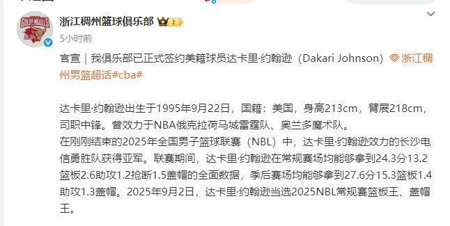 浙江男篮发布官宣,表示球队已经和大外援达卡里-约翰逊完成了签约,目前球队正在走他的注册程序。在前一段时间里,包括新疆男篮等球队都对约翰逊非常感兴趣,但浙江男篮的动作更为果决,直接带着合同找到了约翰逊。约翰逊也被浙江男篮的诚意打动,最终决定加盟浙江男篮效力。