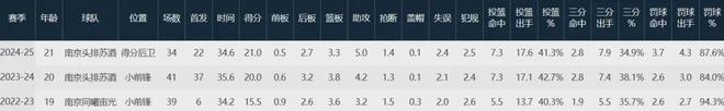 过去三个赛季,林葳均为同曦队出战CBA,24-25赛季哪怕在外援政策四节7人次情况下,常规赛依然能够场均贡献21分3.3板5助1.4断,三项命中率41.3%、34.9%和87.6%;季后赛更是场均狂轰30.5分6.5板11助1.5断豪华数据,三项命中率43.5%、26.3%和94.1%。