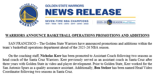 此外,勇士队还宣布了篮球运营部门的一系列其他人事变动。其中值得关注的是,大卫-法托基在担任圣克鲁斯勇士队总经理四年后,被提拔为篮球发展副总裁;已故勇士队助理教练德扬-米洛耶维奇之子尼古拉-米洛耶维奇,也已加入球队,将担任视频协调员兼球员发展相关职务。