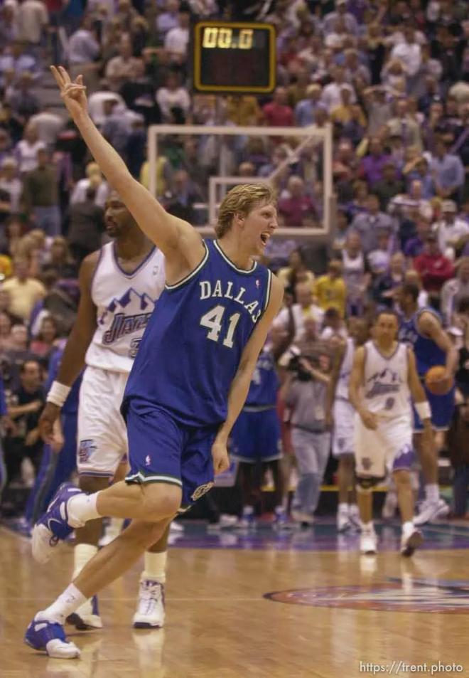 系列赛开局,爵士连胜两场,大比分2-0领先。然后,23岁的诺维茨基爆发了,两场轰下66分,率队扳平比分。