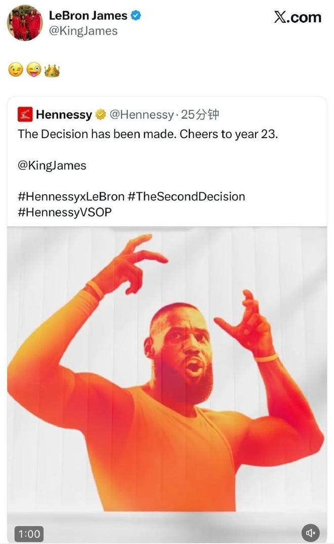原本詹姆斯公布的时间是10月8日0点公布,但如今詹姆斯提前一个小时公布了“决定二”。果然不出所料不是退役决定,他通过社媒视频宣布“决定将自己的天赋带给著名白兰地品牌轩尼诗。”詹姆斯转发了轩尼诗官宣合作的消息,并配上了几个表情包。