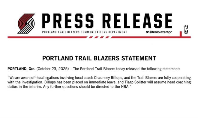 开拓者官方发表声明写道:“我们已知晓有关主教练昌西·比卢普斯的指控,波特兰开拓者正全力配合调查,比卢普斯即日起暂停职务,临时主教练一职将由斯普利特暂代,所有后续进展将由NBA统一处理。”