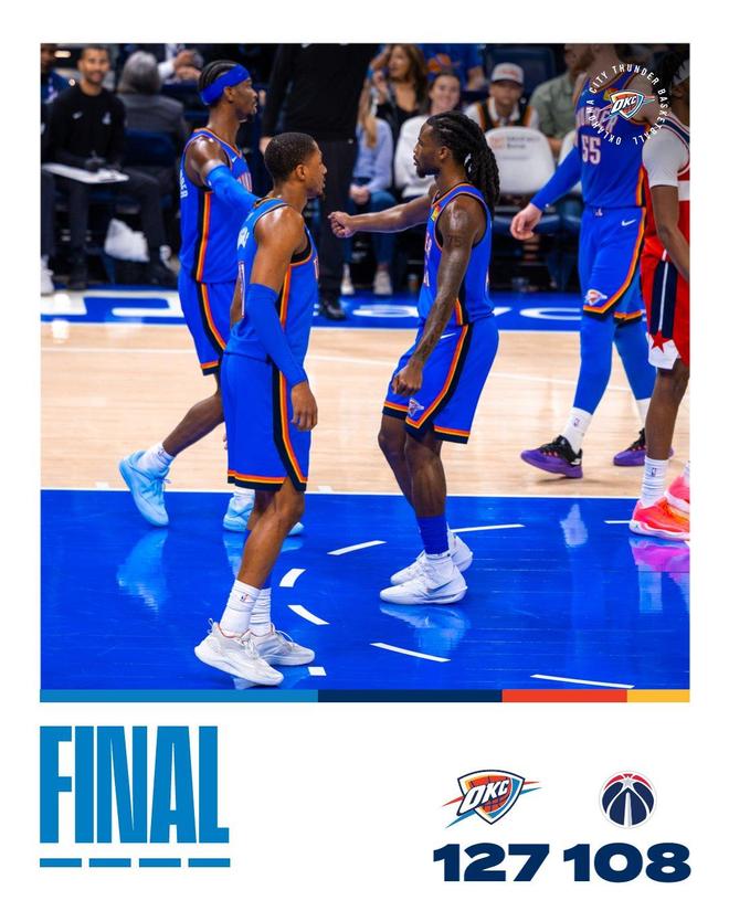 末节决战,哈尔滕施泰因率队实现了全民皆兵,以赛亚乔、米切尔都从替补席发力,雷霆轰出了18比2的进攻狂潮,一举将分差扩大至24分。奇才追分乏力,两队逐渐开始在场上练兵,比赛早早失去了悬念。最终,雷霆以127比108完胜对手。