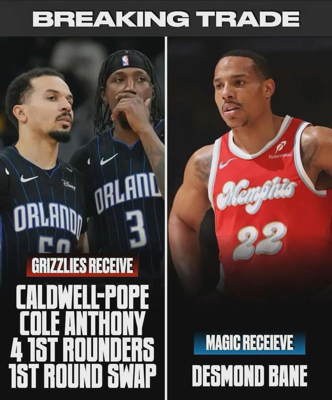 今夏,魔术做出了7换1的大交易,其中包括了4个首轮签:波普、科尔·安东尼、4个首轮签和1个首轮签互换权,跟灰熊换了贝恩。