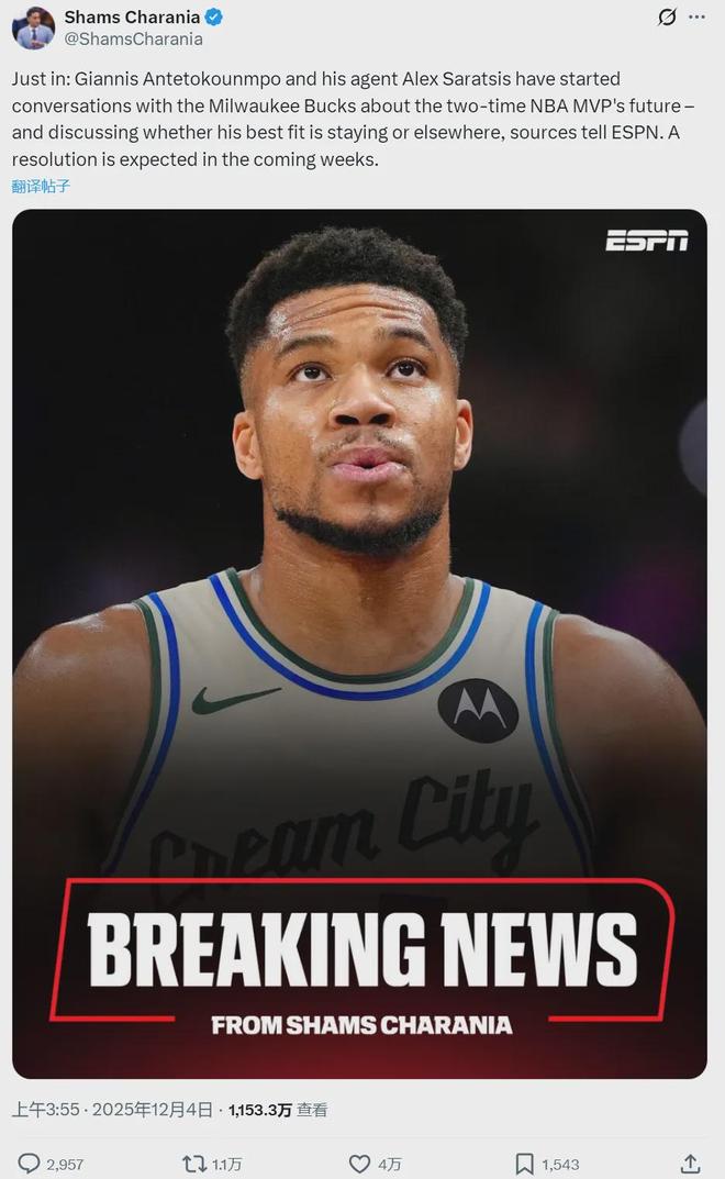 在这个时间点,有消息人士跟Shams表示,除非雄鹿本赛季出现戏剧性的事态转变,否则字母哥的“坏结局”(离队)已经不可避免。