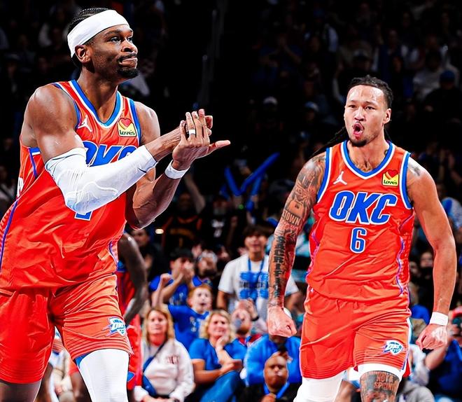 雷霆队的可怕之处在于他们拥有MVP级巨星SGA,赛季至今,SGA场均砍下32.6分+4.6篮板+6.5助攻+1.5抢断+2.3记三分球,三项命中率分别为56.2%,45.4%和88.2%。据NBA官网数据统计,SGA场均正负值高达+15,排在联盟第1位,并打破了由2016年的追梦创造的NBA纪录(+13.21)。更离谱的是,即便SGA不在场,雷霆队也有足够多的牌可以打。据NBA官网数据统计,赛季至今,当SGA在场时,雷霆队百回合净胜分高达19.2;当SGA下场时,雷霆队百回合净胜分依然达到16.2。这就是雷霆队,他们拥有全联盟最均衡的攻防和最好的阵容深度,容错率太高了,悄悄露出冠军相。