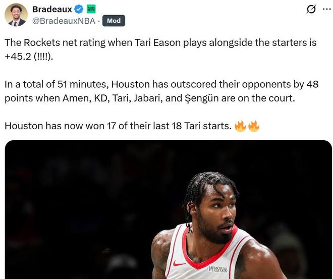 在伊森进入首发的18场比赛中,火箭队拿下17胜1负傲人战绩,当他与杜兰特、阿门、贾巴里、申京一起出战时,火箭队净效率达到夸张的+45.2,一共51分钟时间里面赢了对手48分。