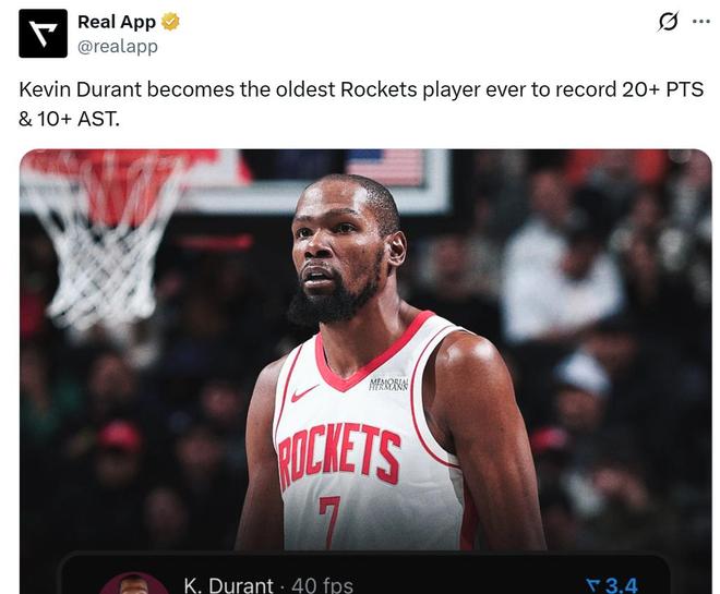 凭借这样的表现,37岁95天的杜兰特超越德雷克斯勒成为火箭队史单场至少拿下20分10助最年长的球员。
