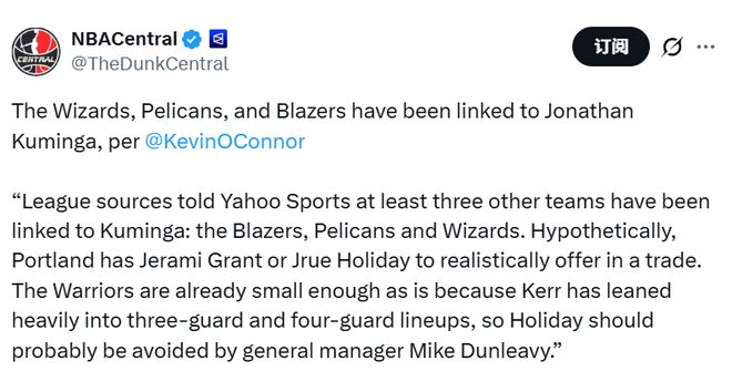 雅虎体育援引联盟消息人士的话称,至少还有三支球队正在追逐库明加,分别是开拓者、鹈鹕和奇才。以下是雅虎体育的报道——