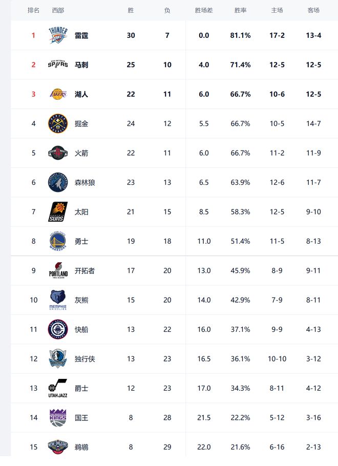 北京时间2026年1月6日,今日NBA有8场比赛,勇士、火箭、快船、掘金、雷霆、太阳、开拓者、爵士参与其中,赛后西部排名发生了变化。