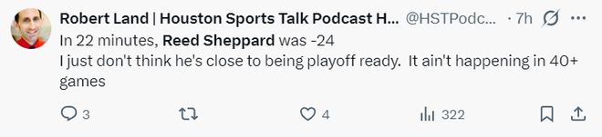 休媒:谢泼德仅出战22分钟在场-24,我觉得他距离一个能在季后赛登场的球员还差得很远,一个已经打了40场+NBA比赛的球员来说他的表现根本不及格。