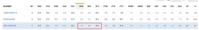 过去的6场比赛,谢泼德场均25.9分钟,拿到12分3.5助攻1.5篮板0.8失误1.5抢断,命中率42.2%,三分命中率30.6%,六场比赛三分球36中11,谢泼德的三分下滑后他在场就没有什么贡献,尤其是他的防守总是被针对。