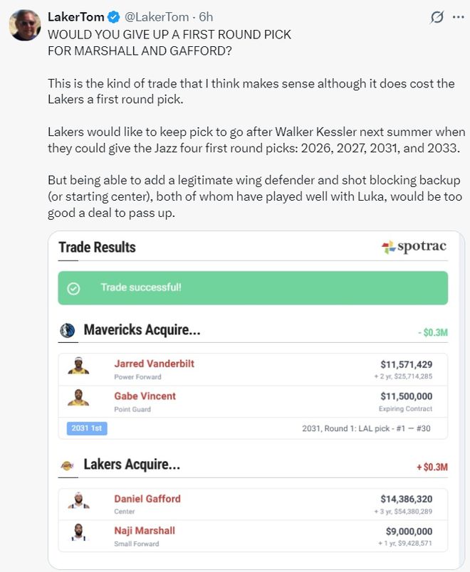 湖人媒体Laker Tom写道:你们愿意放弃一个首轮签来换马绍尔、加福德吗?这笔交易我认为是合理的,尽管湖人会失去一个首轮签。