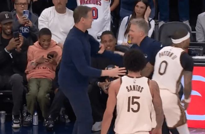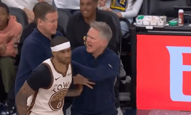 末节前半段,勇士主帅科尔认为科林斯干扰球未吹,且库里还被吹罚犯规,暴怒咆哮连吃两T被驱逐。