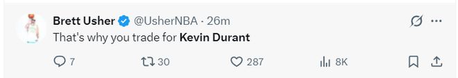 4.杜兰特成为一锤定音的那个人,而布克、狄龙被打得满地找牙。火箭与太阳的交易谁是赢家谁是输家一目了然,把那些该死的家伙送回去吧。