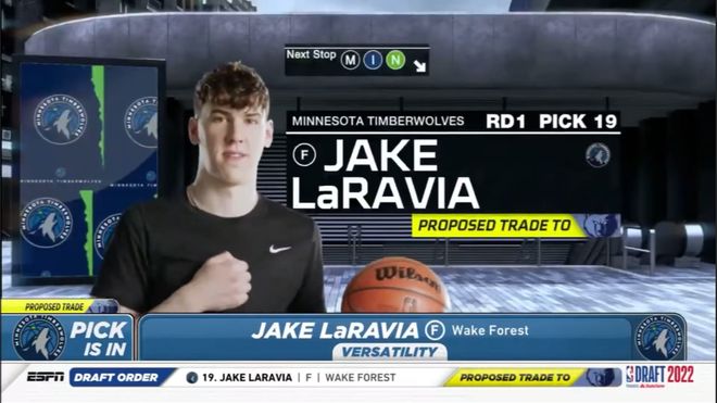 时间回到2022年选秀大会,拉拉维亚在首轮第19顺位被森林狼选中,随后就被交易到了孟菲斯灰熊。