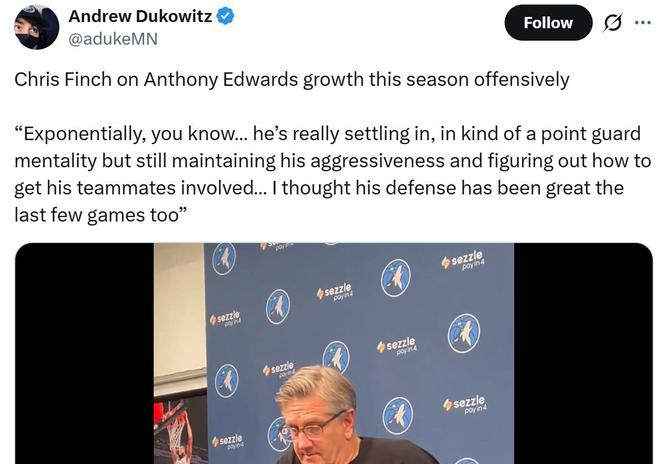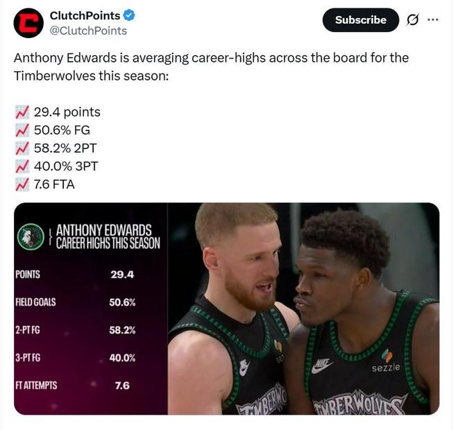 这也是爱德华兹持续大踏步成长的缩影,本赛季爱德华兹在三分投射持续精进的同时,还在组织串联、中距离投射与出手时机选择等方面取得长足进步。