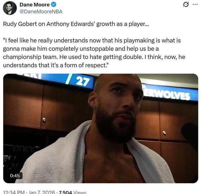 爱德华兹这样的表现也获得森林狼将帅的认可,其中戈贝尔赛后坦言:“他的比赛慢下来了,他对比赛局势的阅读能力越来越强,组织进攻能力正在让他变得无所不能,过去他讨厌被包夹,如今我想他明白了,这种被包夹的方式其实是一种尊重的表现。”