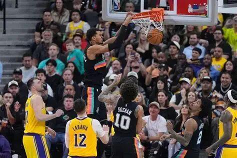 马刺三分不开,但内外贯通了;湖人没办法。当然都不能怪艾顿:他已经算竭力阻挡文班了。第四节他一度后场篮板黄油手,尚帕尼投丢,文班趁艾顿不在内线,补扣拉开13分;之后文班从拉拉维亚背后内切,再一个扣篮: