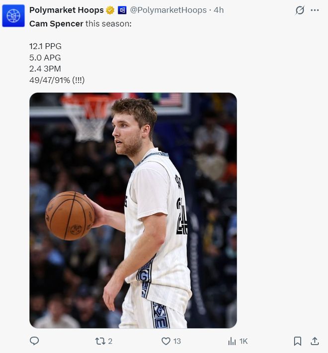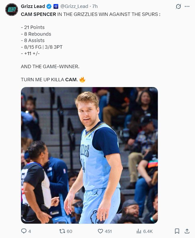 斯潘塞是2024年次轮53顺位被灰熊选中的淘金选手,他24-25赛季是拿双向合同,2025年夏灰熊才跟他签下一份四年1039万的合同,本赛季年薪只有253万,没想到莫兰特本赛季又是各种伤停,这让他有了崭露头角的机会。