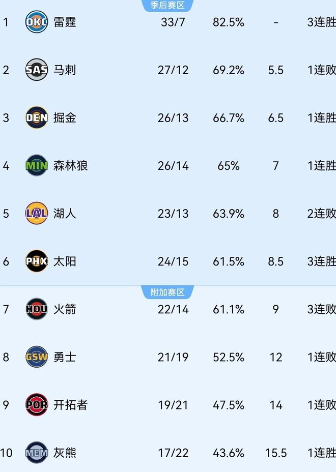 目前火箭以22胜14负排名西部第七,掉进附加赛区域,杜兰特的老东家太阳则顺势以24胜15负上升至季后赛区域。