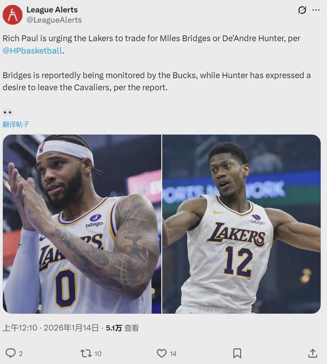 今天还有一则跟里奇-保罗有关的新闻,里奇-保罗和他的经纪公司Klutch Sports正在敦促湖人引进德安德烈-亨特或者迈尔斯-布里奇斯,八村塁和文森特将成为交易筹码。为啥要选亨特和小桥?因为他俩的经纪人都是里奇-保罗。